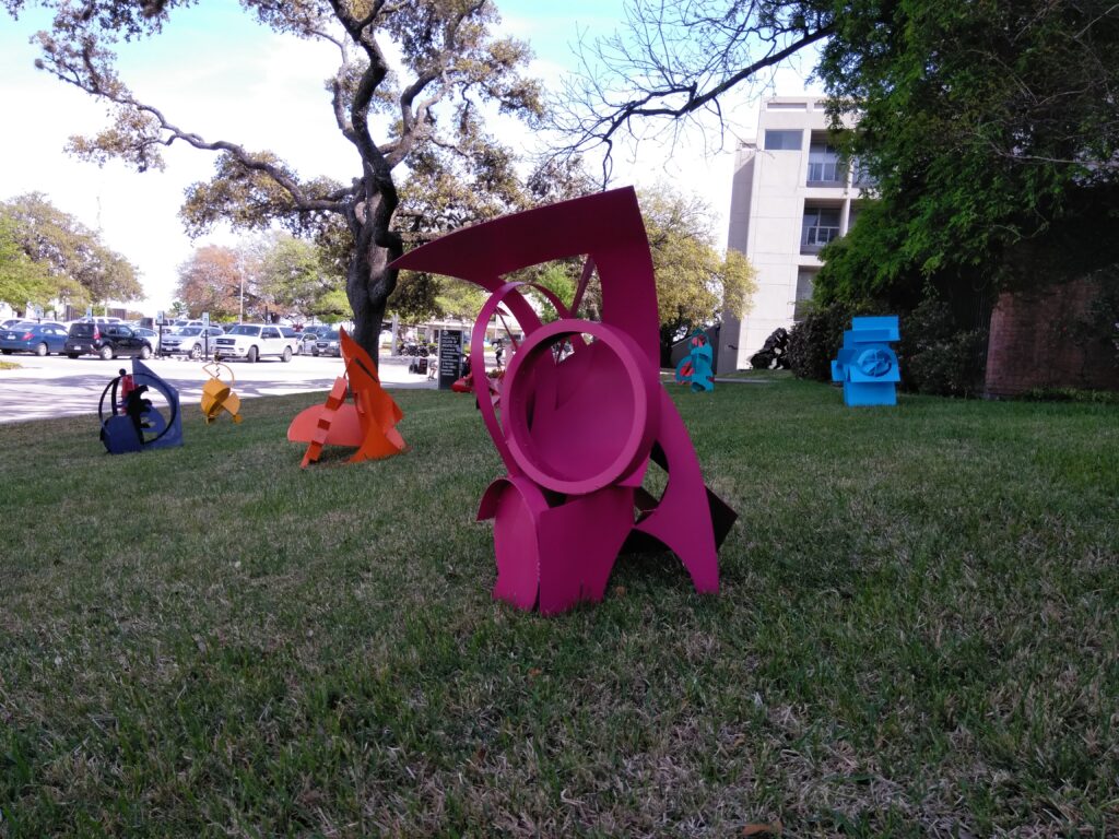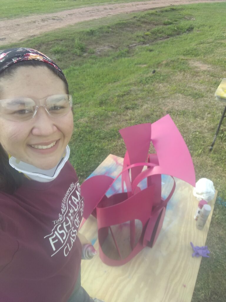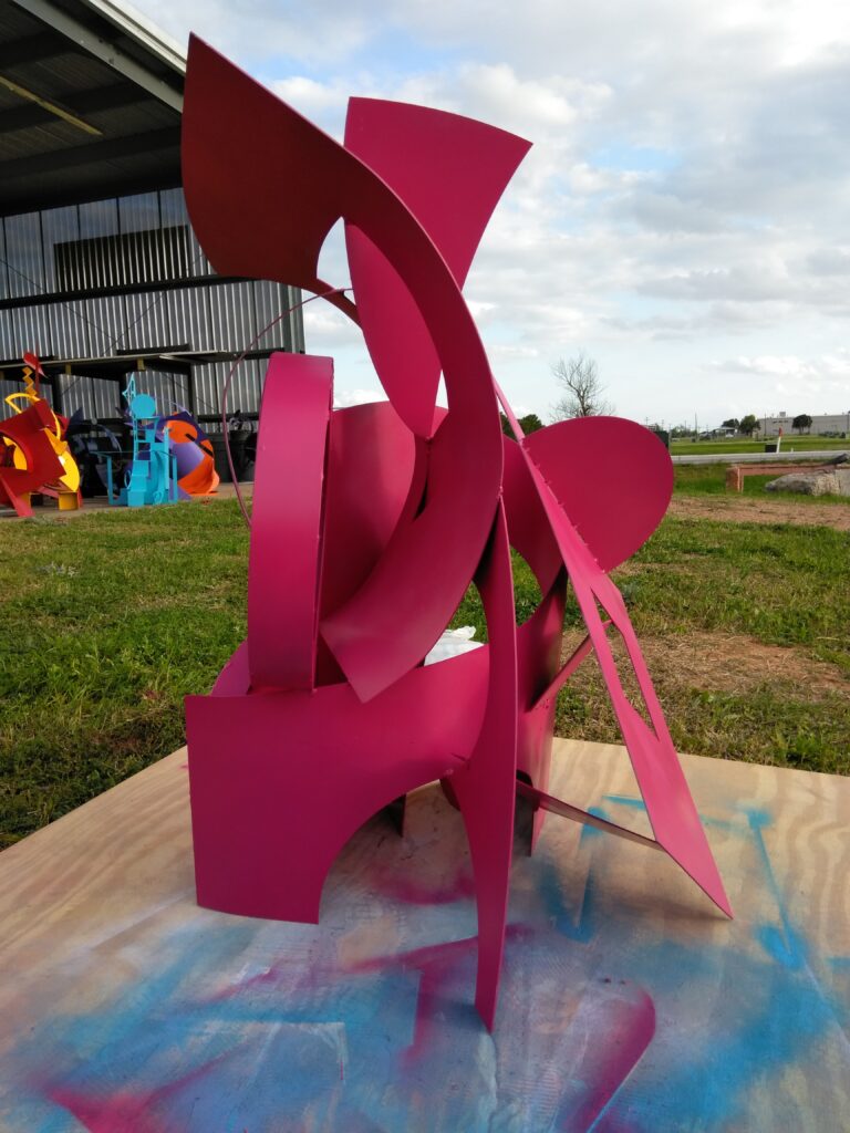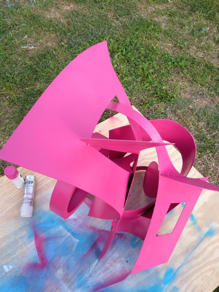This was a welded abstract sculpture. Each student was provided a 10 by 10 foot sheet of steel that was cut by water cut into pieces based on their own design. We then shaped and welding the sculpture ourselves. I made it my goal to use every single with no scrape leftover and succeeded.