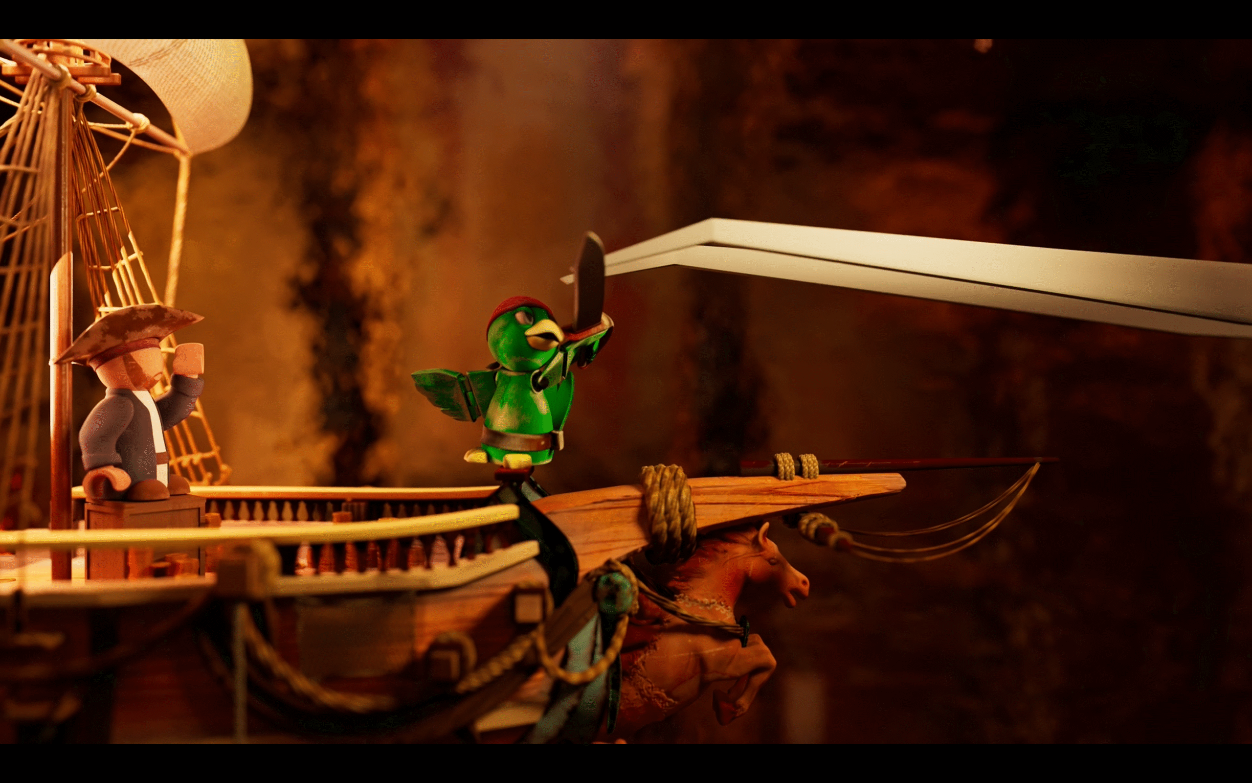 A&M University. The original concept, pitch, and storyboards were mine, while my talented team collaborated with the majority of the technical tasks. I was the look dev artist of the masts and sails and assisted with the lighting and rendering using Pixar RenderMan and Nuke.